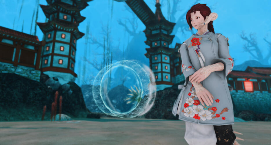 Originally from Sui-no-Sato, it was determined early in her life that Pandora lacked the simple ability to control, or even feel, her own Aether. A rare condition, and one that would ultimately ruin any chance the handmaiden-in-training would have of properly serving the Ruby Princess.While normally those with Pandora's issues were simply given other roles, whispers from the world above the waves gave the elders reason for concern. The Garlean occupation was in full swing, and the fear of her alienation within the city would inevitably bring them ruin. Thus, the elders of Sui-no-Sato decided to secretly break the city's history of non-communication, working to send Pandora off to Kugane and further beyond, and away from any possible Garlean influences within the Ruby Sea.